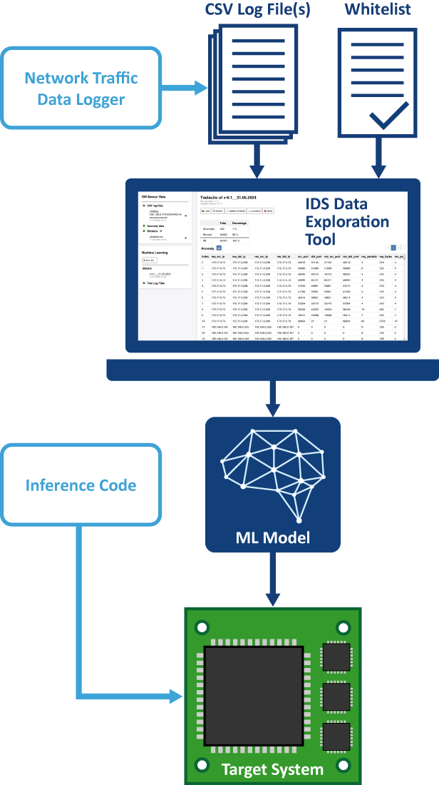The main component of the Embedded IDS is the IDS Data Exploration Tool, or IDET for short. Using the data provided, IDET generates an ML model, meaning an AI algorithm for real-time monitoring of network traffic.